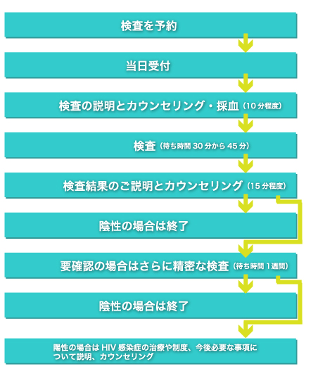 HIV・梅毒・B型肝炎の即日検査(約30分で結果をお伝えします)を受けることができます。ご心配やご不安をじっくりとお聞きし、その内容に適した対応をしますので、安心して検査や説明を受けられます。